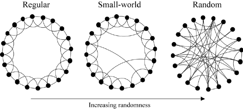 The general implication is that people are much more connected than we realize. In a paper on the notion of āSmall World Theoryā, Watts and Strogatz created a model that demonstrates how people may actually be very close to one another. The model describes a personās networks in terms of a graph: āhighly clustered, like regular lattices, yet have small characteristic path lengths, like random graphsā. A lattice is a regular, ordered grid-like structure, where each node is connected to its neighbors, forming a highly structured network. What matters is this: combined with random graphs, the path lengthāthe distance between any two peopleāshortens. As you see, networks can form specializations in regions or nodes while also sharing a distribution across the entire network.
