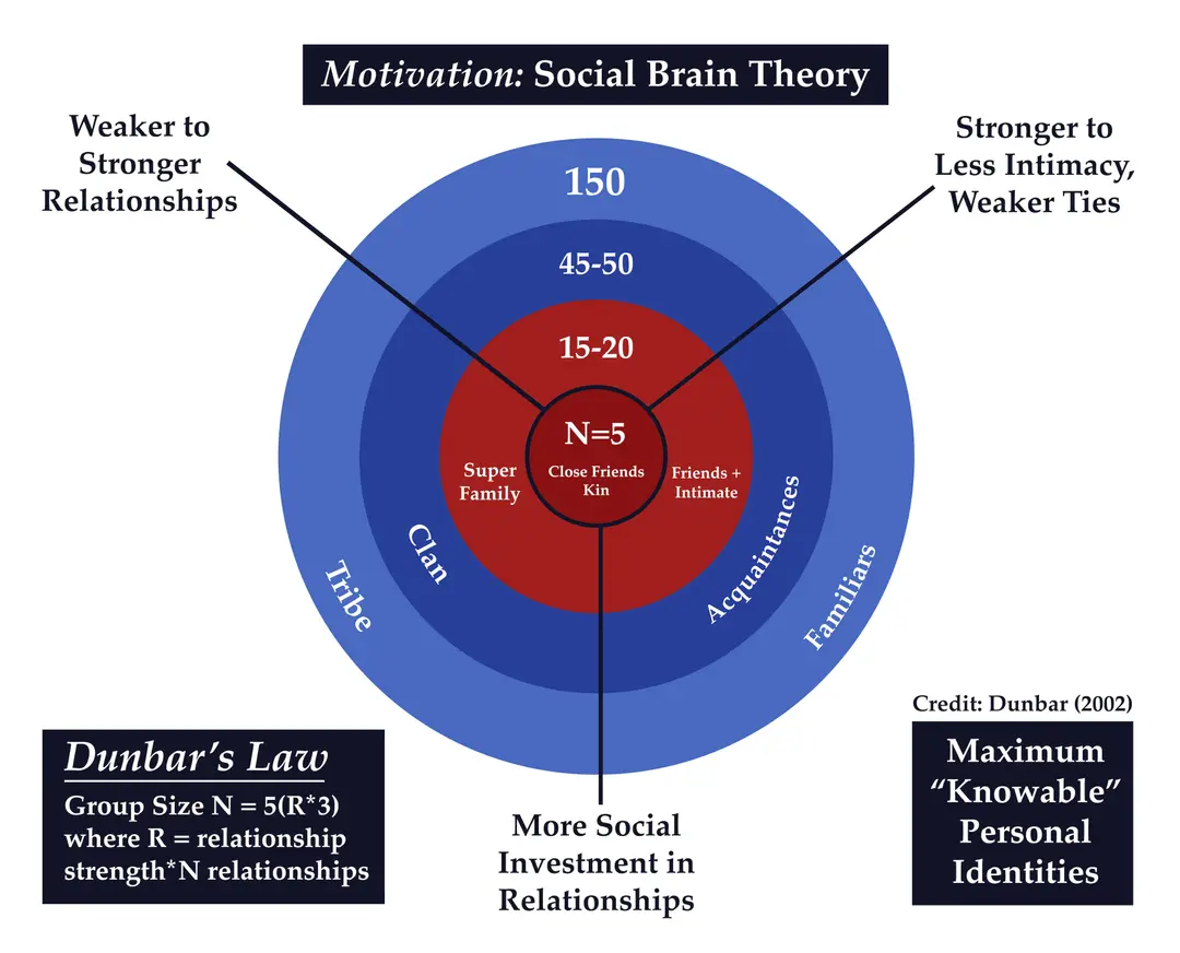 Can we network endlessly? And if so, should we? Probably not. Dunbarās number measures the individualās cognitive limit to how many people they can maintain a stable social relationship with. British anthropologist Robin Dunbar introduced the concept in the 1990s, observing correlations in nonhuman primates and predicting an average human social group size using a regression equation. It reflects the number of stable social relationships that the primate brain can track and maintain, and the limit is defined by āDunbarās numberā at roughly 150. This theory, along with the social brain hypothesis is often studied from the perspective of evolution, in which cognitive ability is expected to adapt to increasingly complex social situations. The cognitive capabilities imply that ā[t]o maintain group cohesion, individuals must be able to meet their own requirements, as well as coordinate their behavior with other individuals in the groupsā. Dunbarās number thus suggests that the limitation on cognitive ability results in a limitation on the number of social relationships people can maintain. ā